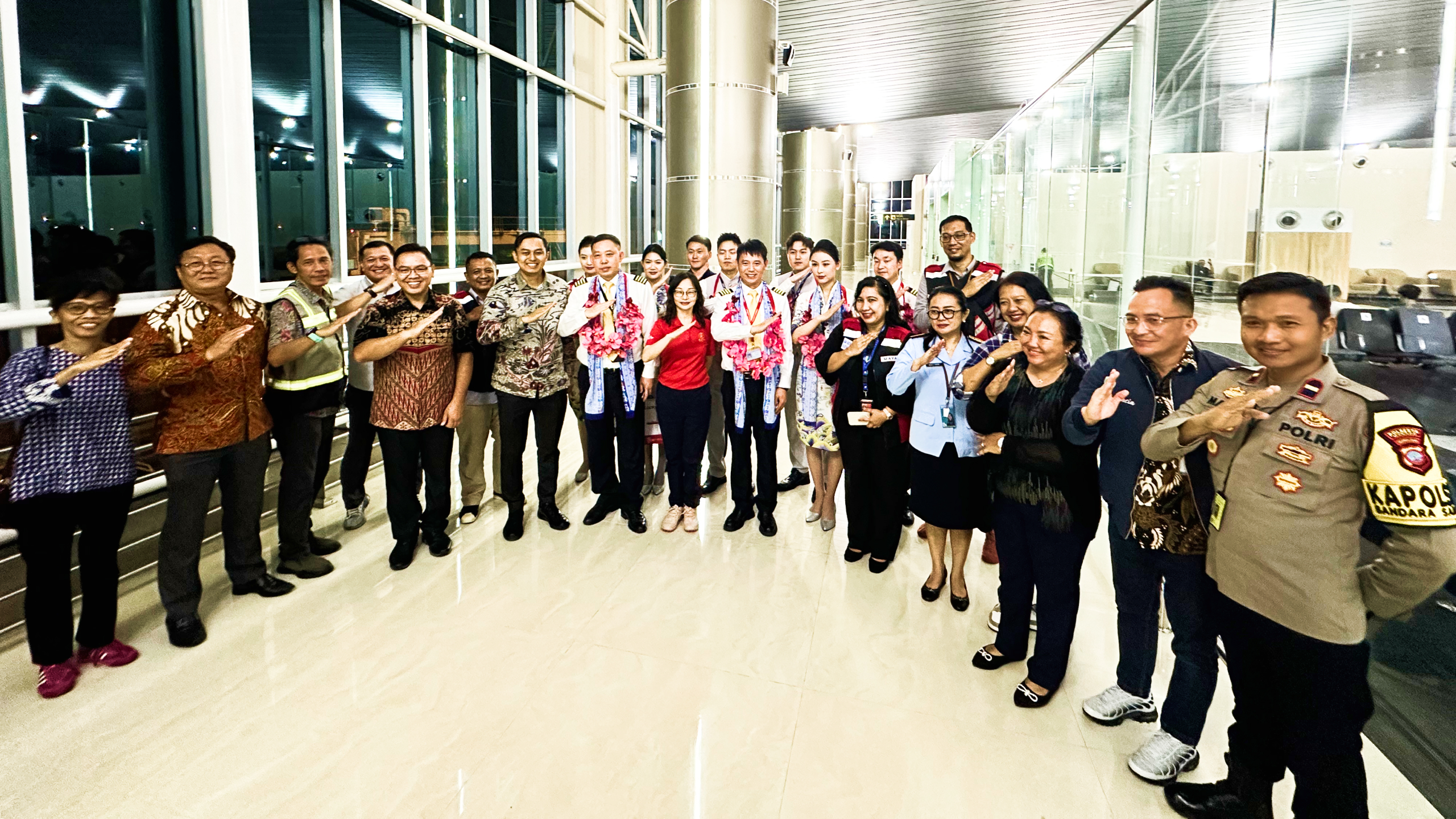 The inaugural flight took place at Sam Ratulangi International Airport in Manado and was attended by the President Director of Grand China Travel, Mrs. Khoe Ting Tjen, and the Commercial and Business Development Director of PT Gapura Angkasa, Mr. Reza Aulia Hakim, as the ground handling service provider. The welcoming ceremony included a traditional water salute. Synergy between the parties is expected to ensure the smooth operation of this international flight.